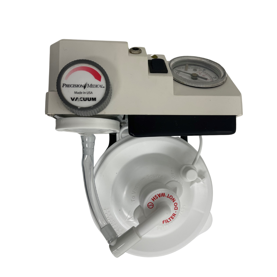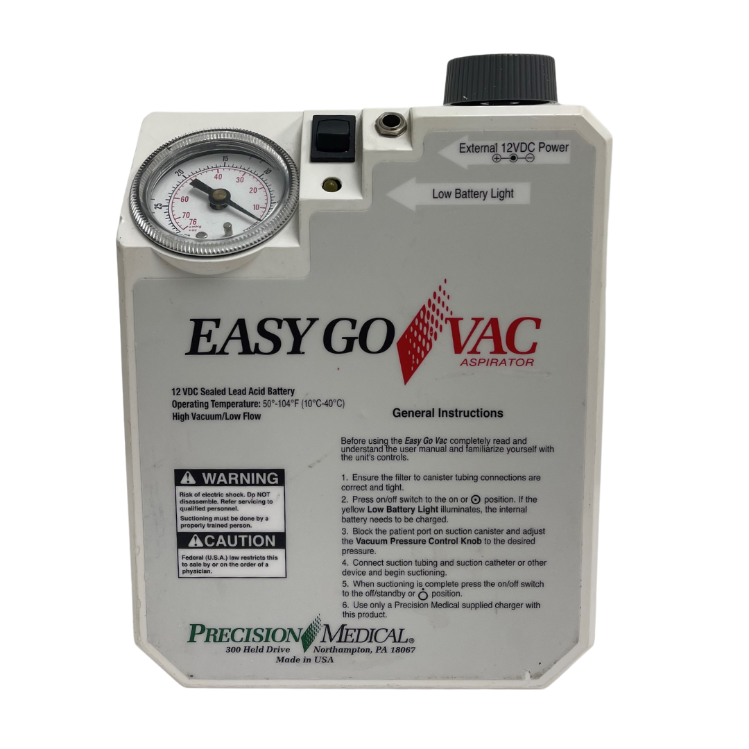 Precision Medical Easy Go Vac Aspirator is a high performance battery operated suction unit that delivers a vacuum range of 2 to 21 mmHg. The standard easy-to-read gauge allows the care giver to adjust the vaccum.